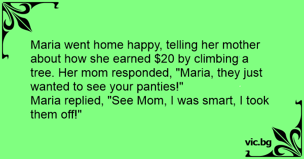 Maria gik glad hjem og fortæller hendes mor om, hvordan hun tjente 100 kr. ved klatring et træ. Hendes mor svarede, “Maria, ville bare se dine trusser!” Hvorefter Maria svarede: “Se mor, jeg var...