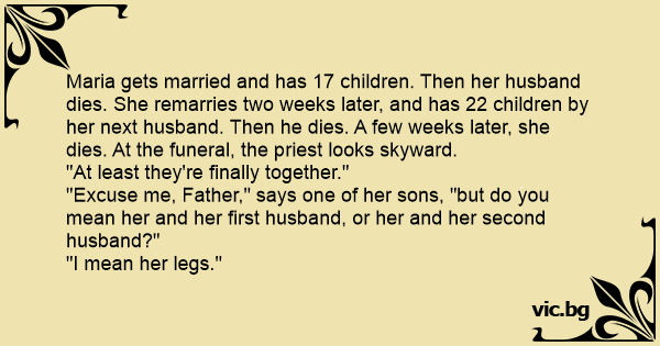 Maria gets married and has 17 children. Then her husband dies. She remarries two weeks later, and has 22 children by her next husband. Then he dies. A few weeks later, she dies. At the funeral, the priest looks skyward.
