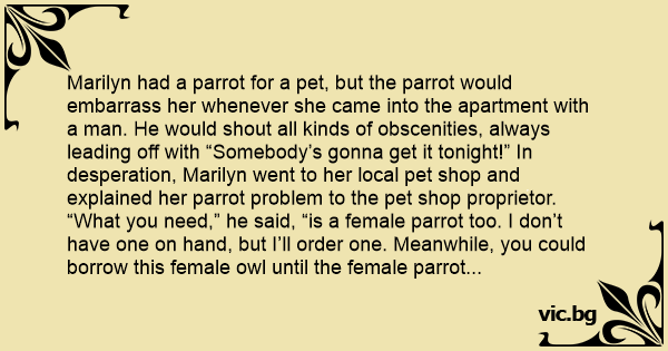 Marilyn had a parrot for a pet, but the parrot would embarrass her whenever she came into the apartment with a man. He would shout all kinds of obscenities, always leading off with “Somebody’s gonna get it tonight!” In desperation, Marilyn went to her local pet shop and explained her parrot problem to the pet shop proprietor.