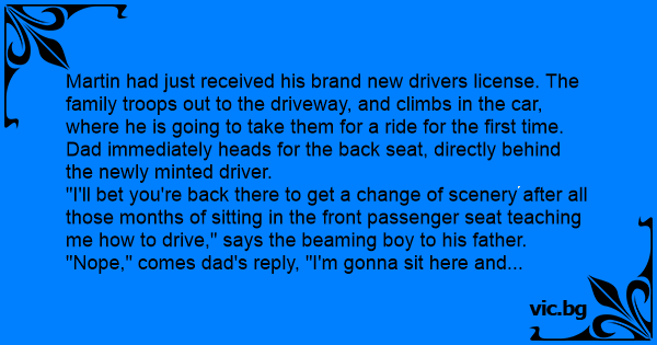 "I'll bet you're back there to get a change of scenery after all those months of sitting in the front passenger seat teaching me how to drive," says the beaming boy to his father.