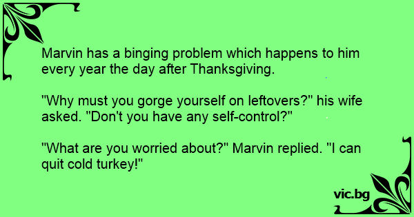 Marvin has a binging problem which happens to him every year the day after Thanksgiving. <br /> <br />"Why must you gorge yourself on leftovers?" his wife asked. "Don't you have any self-control?" <br /> <br />"What are you worried about?" Marvin replied. "I can quit cold turkey!"