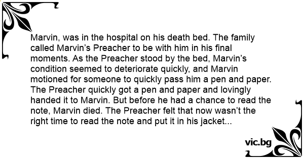 Marvin, was in the hospital on his death bed. The family called Marvin’s Preacher to be with him in his final moments. As the Preacher stood by the bed, Marvin’s condition seemed to deteriorate quickly, and Marvin motioned for someone to quickly pass him a pen and paper.