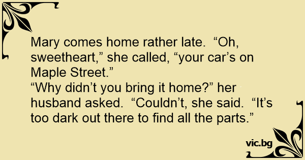 Mary comes home rather late. “Oh, sweetheart,” she called, “your car’s on Maple Street.”