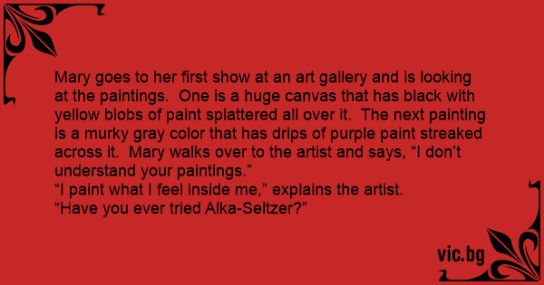 Mary goes to her first show at an art gallery and is looking at the paintings. One is a huge canvas that has black with yellow blobs of paint splattered all over it. The next painting is a murky gray color that has drips of purple paint streaked across it. Mary walks over to the artist and says, “I don’t understand your paintings.”