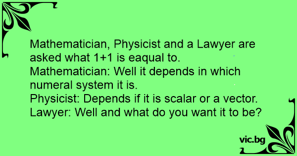 Mathematician, Physicist and a Lawyer are asked what 1+1 is eaqual to.