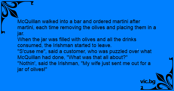 McQuillan walked into a bar and ordered martini after martini, each time removing the olives and placing them in a jar.