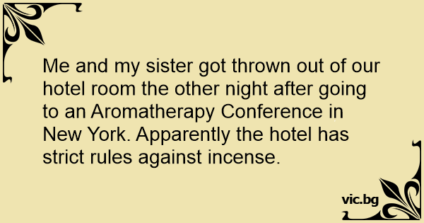 Me and my sister got thrown out of our hotel room the other night after going to an Aromatherapy Conference in New York. Apparently the hotel has strict rules against incense.
