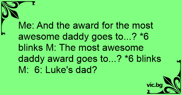 Me: And the award for the most awesome daddy goes to...? *6 blinks M: The most awesome daddy award goes to...? *6 blinks M: 6: Luke's dad?
