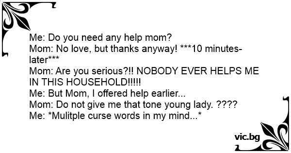 Mom: Are you serious?!! NOBODY EVER HELPS ME IN THIS HOUSEHOLD!!!!!