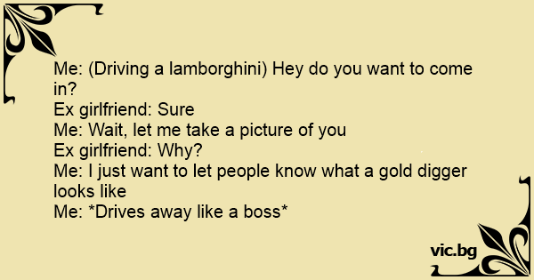 Me: (Driving a lamborghini) Hey do you want to come in?