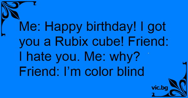 Me: Happy birthday! I got you a Rubix cube! Friend: I hate you. Me: why? Friend: I’m color blind