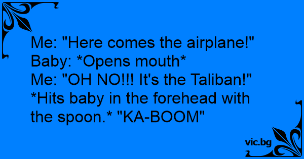 Me: "OH NO!!! It's the Taliban!" *Hits baby in the forehead with the spoon.* "KA-BOOM"