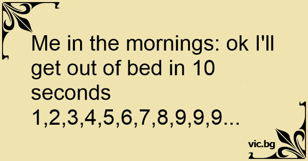 Me in the mornings: ok I'll get out of bed in 10 seconds 1,2,3,4,5,6,7,8,9,9,9...
