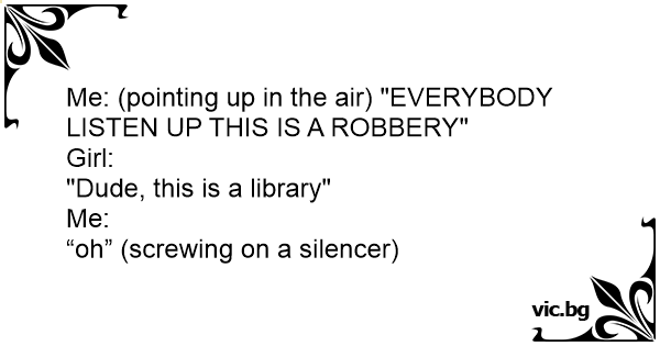 Me: (pointing up in the air) "EVERYBODY LISTEN UP THIS IS A ROBBERY"