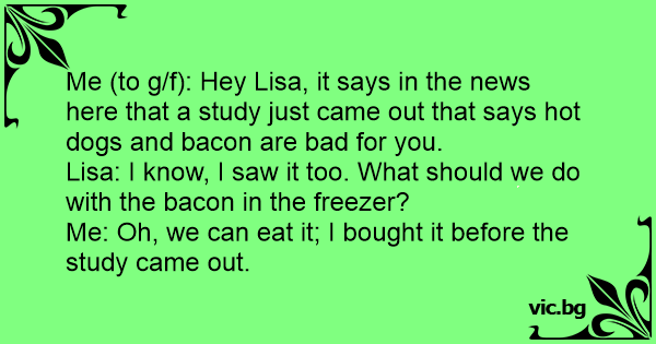 Me (to g/f): Hey Lisa, it says in the news here that a study just came out that says hot dogs and bacon are bad for you.