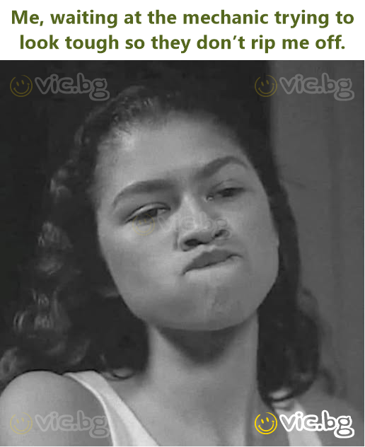 Јас, чекам кај механичарот и се обидувам да изгледам строга за да не ме залажат.