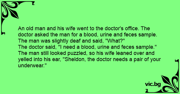 The man still looked puzzled, so his wife leaned over and yelled into his ear, "Sheldon, the doctor needs a pair of your underwear."