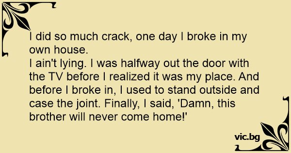 I ain't lying. I was halfway out the door with the TV before I realized it was my place. And before I broke in, I used to stand outside and case the joint. Finally, I said, 'Dамn, this brother will never come home!'