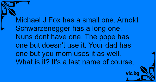 - Какво е това, което на Шон Пен му е много късо, на Арнолд Шварценегер е много дълго, Мадона изобщо го няма, а на Папата не му трябва? - Фамилията.