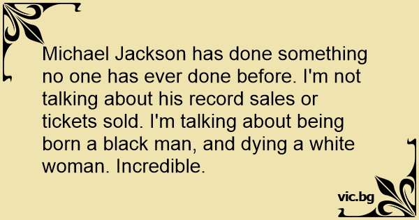 Michael Jackson has done something no one has ever done before. I'm not talking about his record sales or tickets sold. I'm talking about being born a black man, and dying a white woman. Incredible.