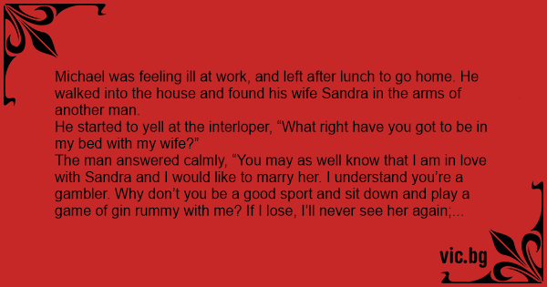 The man answered calmly, “You may as well know that I am in love with Sandra and I would like to marry her. I understand you’re a gambler. Why don’t you be a good sport and sit down and play a game of gin rummy with me? If I lose, I’ll never see her again; if you lose, you must agree to divorce her…. Okay?”