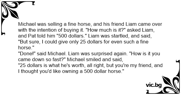 Michael was selling a fine horse, and his friend Liam came over with the intention of buying it. "How much is it?" asked Liam, and Pat told him "500 dollars." Liam was startled, and said,