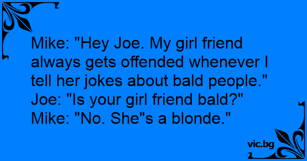 Mike: "Hey Joe. My girl friend always gets offended whenever I tell her jokes about bald people."