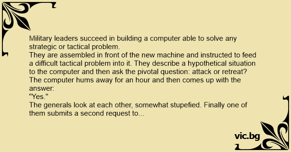 The generals look at each other, somewhat stupefied. Finally one of them submits a second request to the computer: