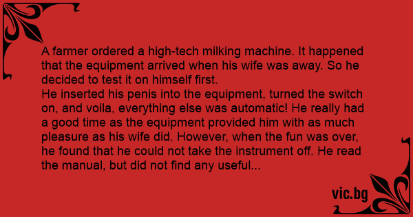 En bonde hade en högteknologisk mjölkmaskin. En dag när frun var bortrest beslöt han att prova den på sig själv. Han stoppade in sitt styva organ och startade maskinen. Det fungerade utmärkt. Men...