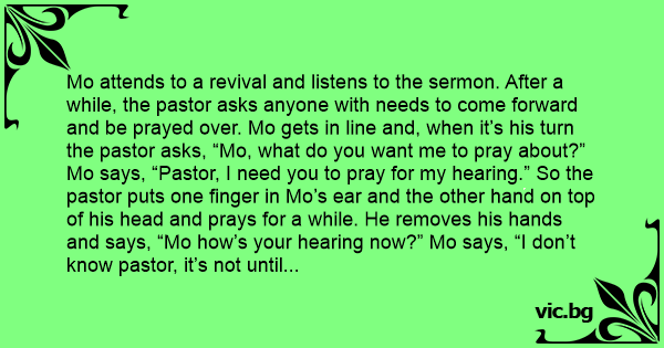 Mo attends to a revival and listens to the sermon. After a while, the pastor asks anyone with needs to come forward and be prayed over. Mo gets in line and, when it’s his turn the pastor asks, “Mo, what do you want me to pray about?” Mo says, “Pastor, I need you to pray for my hearing.” So the pastor puts one finger in Mo’s ear and the other hand on top of his head and prays for a while. He removes his hands and says, “Mo how’s your hearing now?” Mo says, “I don’t know pastor, it’s not until next Monday.