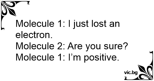 Two molecules are walking down the street and one starts looking around. The other asks, "What's wrong?" "I have lost my electron!" "Are you sure?" "I'm positive!"