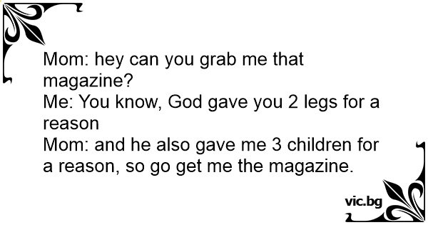 Mom: and he also gave me 3 children for a reason, so go get me the magazine.