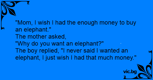 The boy replied, "I never said I wanted an elephant, I just wish I had that much money."
