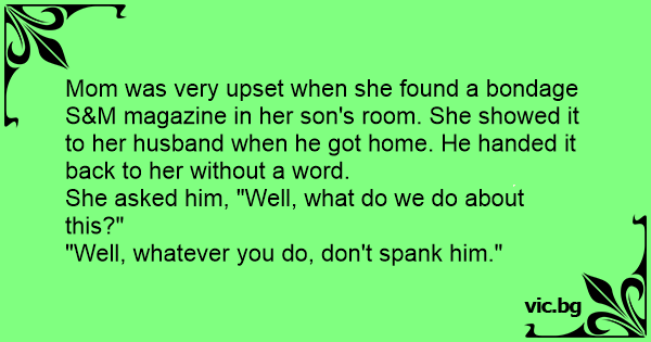 Mom was very upset when she found a воndаgе S&M magazine in her son's room. She showed it to her husband when he got home. He handed it back to her without a word.