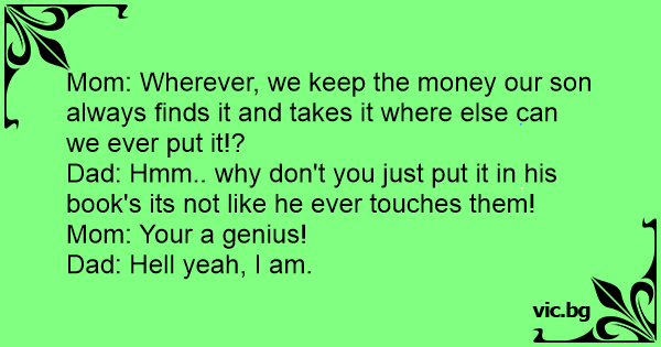 Dad: Hmm.. why don't you just put it in his book's its not like he ever touches them! Mom: Your a genius!