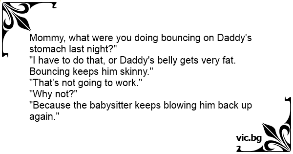 - Mamma, varför guppade du upp och ner på pappas mage igår kväll? - Jag är tvungen att göra så, annars blir pappas mage jättetjock, guppandet håller honom smal. - Det kommer inte att fungera! -...