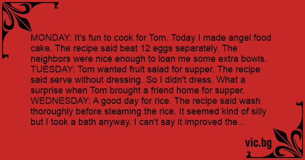 THURSDAY: Today Tom asked for salad again. I tried a new recipe. It said prepare ingredients, lay on a bed of lettuce one hour before serving. Tom asked me why I was rolling around in the garden.
