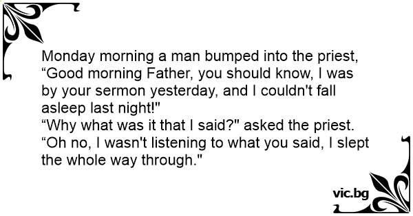 Monday morning a man bumped into the priest, “Good morning Father, you should know, I was by your sermon yesterday, and I couldn't fall asleep last night!"