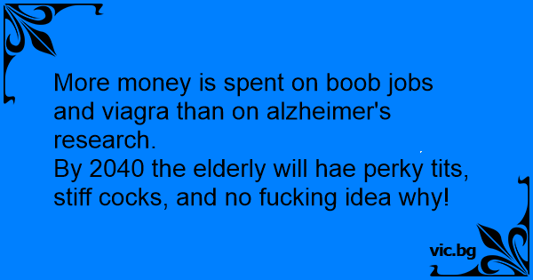 It has been revealed that the latest research shows more money is now spent on boob jobs and Viagra than on Alzheimer’s research. This means that by 2040, the elderly will all have perky tits and...