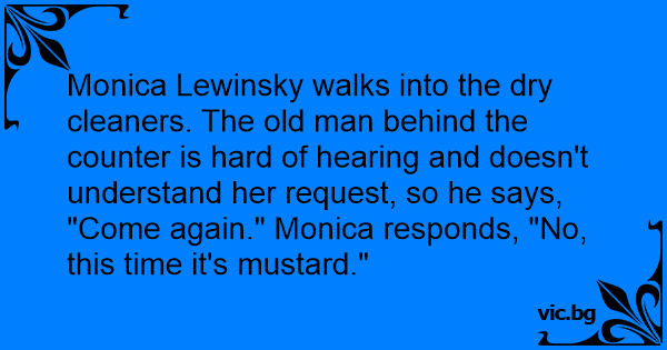 Monica Lewinsky walks into the dry cleaners. The old man behind the counter is hard of hearing and doesn't understand her request, so he says, "Come again." Monica responds, "No, this time it's mustard."