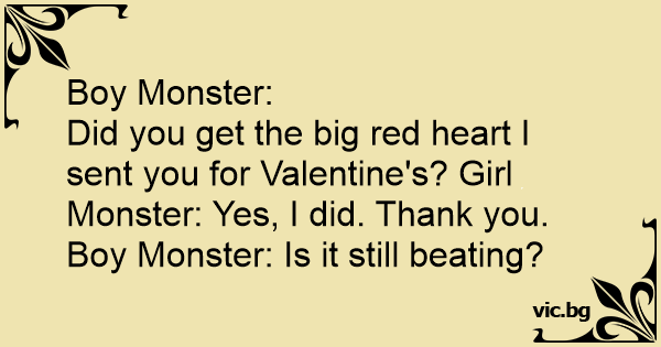 Did you get the big red heart I sent you for Valentine's? Girl Monster: Yes, I did. Thank you. Boy Monster: Is it still beating?