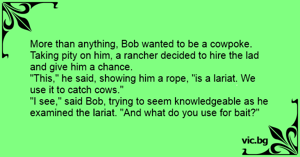 "I see," said Bob, trying to seem knowledgeable as he examined the lariat. "And what do you use for bait?"