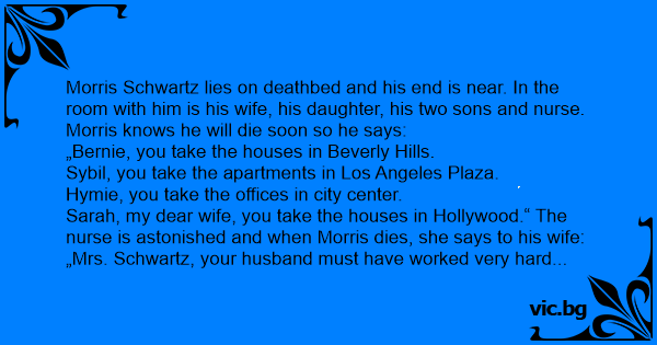 Sarah, my dear wife, you take the houses in Hollywood.“ The nurse is astonished and when Morris dies, she says to his wife: