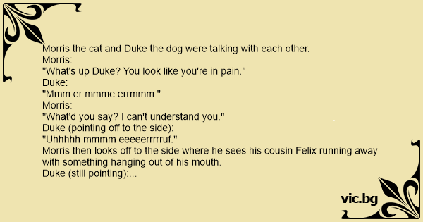 Morris then looks off to the side where he sees his cousin Felix running away with something hanging out of his mouth.