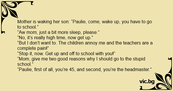 Reggel van. Az anya kelti a fiát. - Fiam, kelj fel, iskolába kell menned! - Nem akarok! - Mondj 2 nyomós érvet, hogy miért nem! - 1. Az összes gyerek utál, 2. Az összes tanár utál! - Ez nem nyomós...