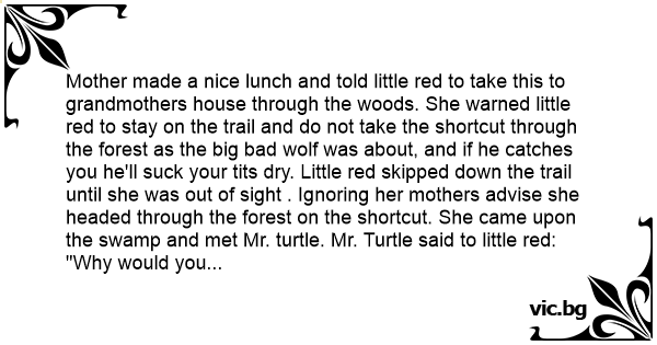 Mother made a nice lunch and told little red to take this to grandmothers house through the woods. She warned little red to stay on the trail and do not take the shortcut through the forest as the big bad wolf was about, and if he catches you he'll suск your тiтs dry. Little red skipped down the trail until she was out of sight . Ignoring her mothers advise she headed through the forest on the shortcut. She came upon the swamp and met Mr. turtle. Mr. Turtle said to little red: