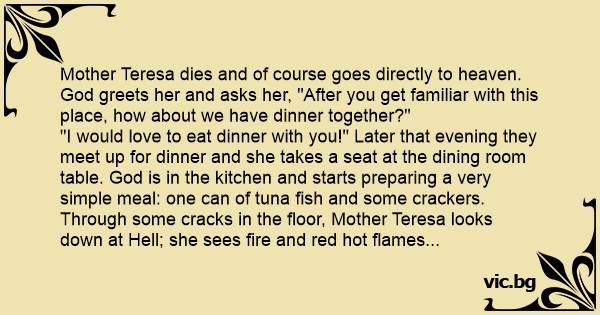 "I would love to eat dinner with you!" Later that evening they meet up for dinner and she takes a seat at the dining room table. God is in the kitchen and starts preparing a very simple meal: one can of tuna fish and some crackers. Through some cracks in the floor, Mother Teresa looks down at Неll; she sees fire and red hot flames with hundreds of thousands of people, and they are dining on lobster, fine wine, chocolate cakes, steaks, pancakes, row after row of fine food. Mother Teresa can't help but ask, "God, look at how they're eating down there. Shouldn't we be dining even better than Неll? You are just serving canned tuna and crackers..." God says, "Well, I figure since it's just the two of us, why cook?"