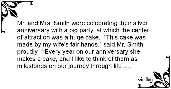 Mr. and Mrs. Smith were celebrating their silver anniversary with a big party, at which the center of attraction was a huge cake. “This cake was made by my wife’s fair hands,” said Mr. Smith proudly. “Every year on our anniversary she makes a cake, and I like to think of them as milestones on our journey through life ….”