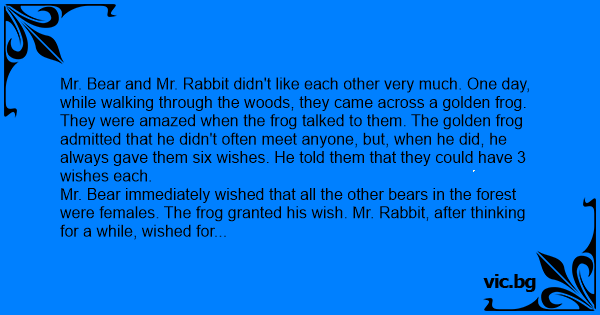 Mr. Bear immediately wished that all the other bears in the forest were females. The frog granted his wish. Mr. Rabbit, after thinking for a while, wished for a crash helmet. One appeared immediately, and he placed it on his head. Mr. Bear was amazed at Mr. Rabbit's wish, but carried on with his second wish. He wished that all the bears in the neighboring forests were females as well, and the frog granted his wish.