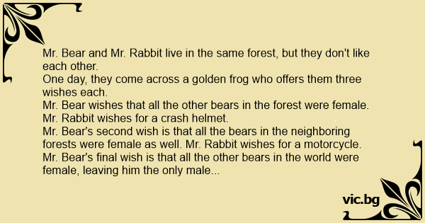Mr. Bear wishes that all the other bears in the forest were female. Mr. Rabbit wishes for a crash helmet.